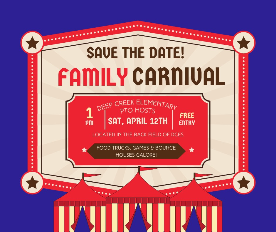 Save the Date for DCES's Family Carnival, hosted by our DCES PTO! Saturday, April 12th at 1 pm. FREE ENTRY FOR ALL!. Located in the back field of DCES. There will be food trucks, games, and bounce houses galore! Hope to see you there! (UPDATED 1/29)